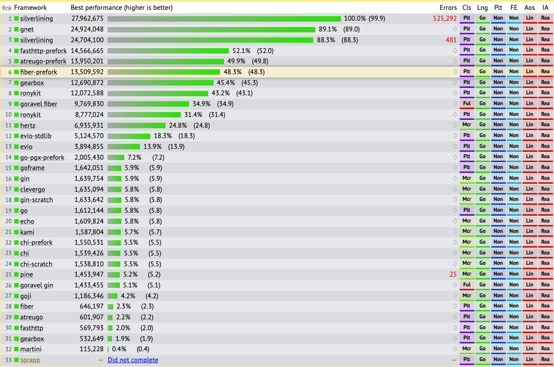 Fiber - 13,509,592 responses per second with an average latency of 0.9 ms.